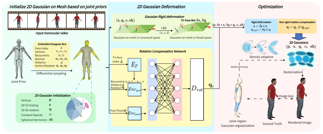 High-quality, animatable 3D human avatar reconstruction from monocular videos offers significant potential for reducing reliance on complex hardware, making it highly practical for applications in game development, augmented reality, and social media. However, existing methods still face substantial challenges in capturing fine geometric details and maintaining animation stability, particularly under dynamic or complex poses. To address these issues, we propose a novel real-time framework for animatable human avatar reconstruction based on 2D Gaussian Splatting (2DGS). By leveraging 2DGS and global SMPL pose parameters, our framework not only aligns positional and rotational discrepancies but also enables robust and natural pose-driven animation of the reconstructed avatars. Furthermore, we introduce a Rotation Compensation Network (RCN) that learns rotation residuals by integrating local geometric features with global pose parameters. This network significantly improves the handling of non-rigid deformations and ensures smooth, artifact-free pose transitions during animation. Experimental results demonstrate that our method successfully reconstructs realistic and highly animatable human avatars from monocular videos, effectively preserving fine-grained details while ensuring stable and natural pose variation. Our approach surpasses current state-of-the-art methods in both reconstruction quality and animation robustness on public benchmarks.