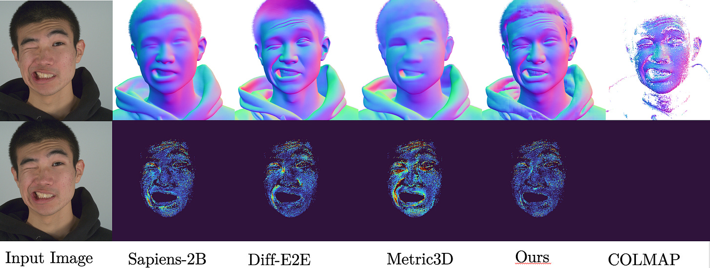 This paper builds on the work of FLAME and DINOv2 with augmentation from NPHM, FaceScape and Ava256. If you’ve been following similar research in this category (several examples of which have even been featured in the last few weeks of posts here), one thing that may be immediately apparent is the quality of Pixel3DMM seems like a clear step forward in terms of likeness and stability. FLAME has become a ubiquitous foundation and benchmark, but it’s immediately apparent to a keen observer that it is only a rough approximation.